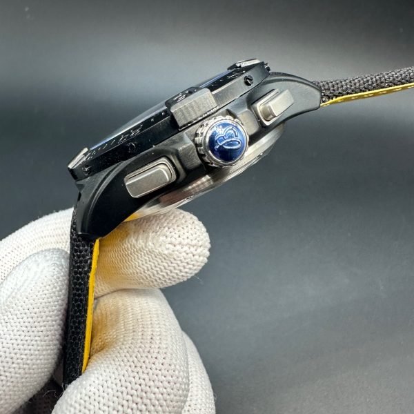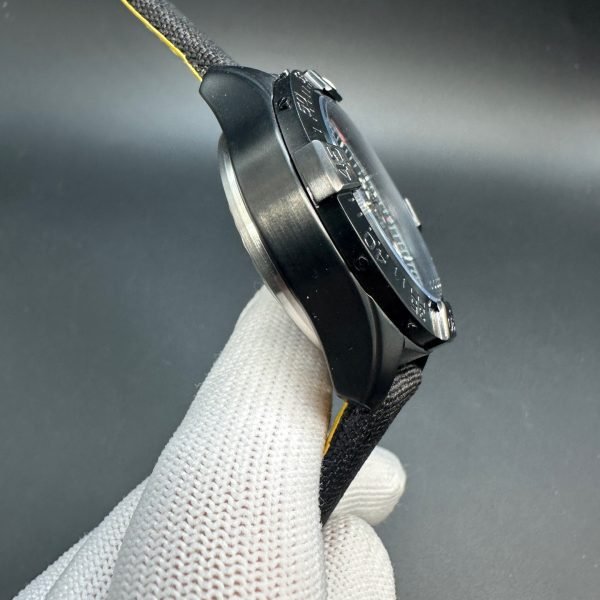 Made of black ceramic case, this 44mm men’s watch is durable with a smooth and fashionable appearance. Unidirectional rotating ratcheted bezel is easy to read the time. Black leather strap is comfortable with a hint of sophistication. Ideal for daily casual wear or an occasion.