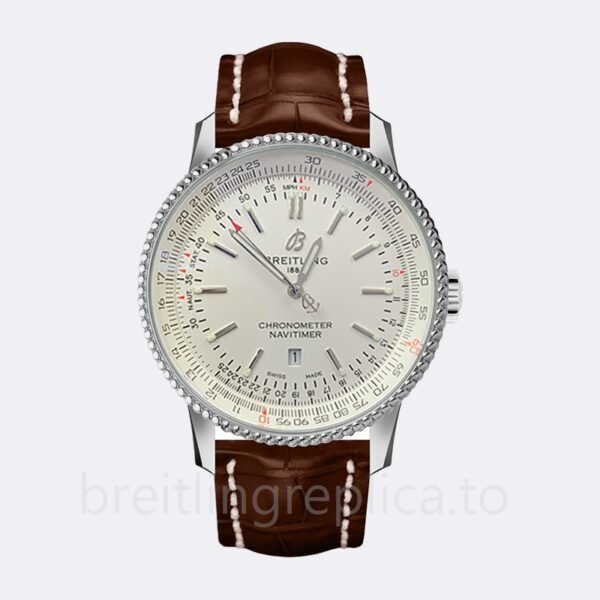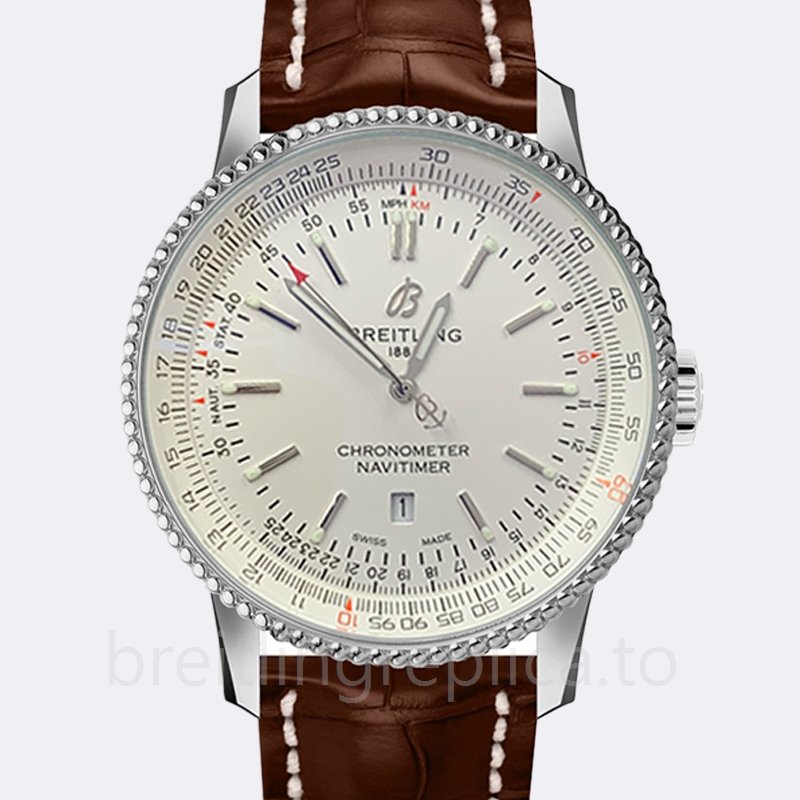 Dial ColorWhite DialSeriesNavitimerCase ColorSilver-toneBandLengthAround 18cmModelA17326211G1P1-001BrandBreitlingGenderMen’sCaseSize46mmDial Markers: Index. The indexes in a watch are used as dial markers instead of usual Roman numerals to indicate the time.Bezel Material: Stainless Steel. A stainless steel bezel is the perfect material to use when designing a watch. The bezel will have endurable elegance, high performance, and high durability.Watch Case: 316L. The case made of 316L is one of the most heat-resistant stainless steel grades. Its corrosion resistance is very good, even at temperatures as high as 1100*F, without any further heat treatment.Case Back: Solid. The sturdy back cover allows you to use it longer and keep the watch longer.Luminiscence: Hands. The luminosity of the watch is hands. With this watch, you will not lose your time in dark.Crystal: Sapphire Crystal. The material of the watch is a lustrous and transparent crystal, which is usually used for high-precision optical instruments. Tip: The first-range cheap movement version is made of mineral glass.Hand: Silver Tone. The hands of the replica watch is silver-tone which is pretty cool and fashionable.Band Material: Leather.A leather band is used for the watch, which has excellent properties in preventing sweat and moisture, and has no allergic reaction to the skin.Clasp: Deployment. The clasp design of the watch can be a very appealing option to many consumers. Of course, one must keep in mind that the product should be durable and hold up for a long time. This watch bracelet has been made to meet all those needs. It is manufactured using high-quality materials, designed with the concept of visual impact, and perfectly matches today’s fashion trends.Second Markers: Minute markers around the outer rim. As shown in the picture above, the second mark on the watch is the minute mark around the outer edge.Water Resistance: 30 meters. The watch’s waterproof depth is 30 meters, which is fully enough for your daily life. Tips: The standard configuration is just life waterproof, need to purchase additional waterproof service which is up to 30 meters.”A Replica”/”Quartz” version watch tip: This version is very discounted, the sub-dial index of “A Replica”/”Quartz” may be different from the original watch, please understand. If you really care about the differences, it’s better to choose our AAA and AAAAA versions. Also, due to differences in lighting and angles, please allow for slight differences between the main image and the real thing – especially for “A Replica”/”Quartz” version. In addition, you are welcome to view our physical pictures, if necessary, please contact our customer service. Thanks.