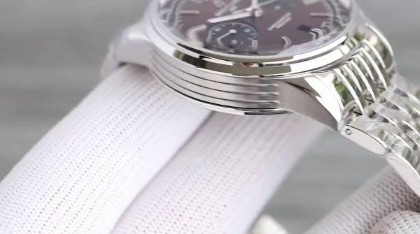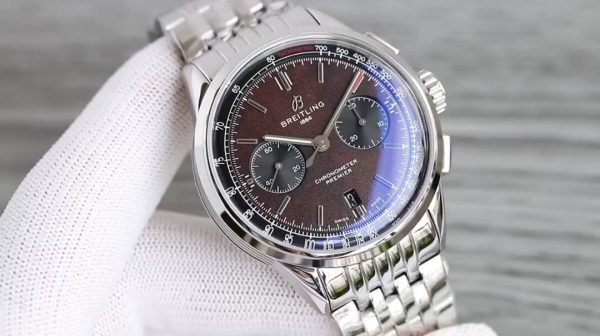 This stunning Breitling Premier AB01181A1Q1A1 replica timepiece combines the motoring luxury automobile sophistication with a clear nod to Bentley’s heritage craftsmanship. Its warm brown elm wood dial reminiscent of the 1929 Bentley “Blower” racing car wooden dashboard is in a 42mm stainless steel case. The precise dial has black subdials for 30-minute chronograph counter and small seconds, with the outer tachymeter scale indicated by a thin red “Tachymeter” writing giving it a sporty feel.