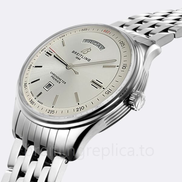 ModelA45340211G1X4-001SeriesPremierBandWidthAround 22mmCaseThickness14mmBrandBreitlingDial ColorWhite DialMovementAutomaticGenderMen’sSecond Markers: Minute markers around the outer rim. The second mark on the watch is also called the hand of the clock. This design element is used in many famous designs such as clocks and other objects.Hand: Silver Tone. As you can see in the pictures above, the hand design of the watch is silver-tone, which can highly improve the outlook of the watch.Clasp: Fold Over Clasp. A fold over clasp is used here which is more durable and stylish.Band Material: 316L. The band is the most important part of the watch. 316L can help form a corrosion protection film on the surface of metal materials.Case Back: Solid. The hard solid bottom cover is neither soft nor flexible. Made of steel, it has excellent durability and scratch resistance.Water Resistance: 30 meters. The watch’s waterproof depth is 30 meters, which is fully enough for your daily life. Tips: The standard configuration is just life waterproof, need to purchase additional waterproof service which is up to 30 meters.Bezel Material: Stainless Steel. The bezel, made of stainless steel bezel, a unique structure that makes it an excellent choice for watches. The material can resist scratches, abrasions and indentation. This bezel material is the most resistant to heat and cold of all materials used in watchmaking.Crystal: Sapphire Crystal. Sapphire glass has high-quality glass, you can clearly see the dial. Tip: The first-range cheap movement version is made of mineral glass.Watch Case: 316L. The shell made of 316L has excellent corrosion resistance, excellent wear resistance and good wear resistance.Luminiscence: Hands. Regarding this watch, luminescence is hands. As you can see in the pictures above.”A Replica”/”Quartz” version watch tip: This version is very discounted, the sub-dial index of “A Replica”/”Quartz” may be different from the original watch, please understand. If you really care about the differences, it’s better to choose our AAA and AAAAA versions. Also, due to differences in lighting and angles, please allow for slight differences between the main image and the real thing – especially for “A Replica”/”Quartz” version. In addition, you are welcome to view our physical pictures, if necessary, please contact our customer service. Thanks.
