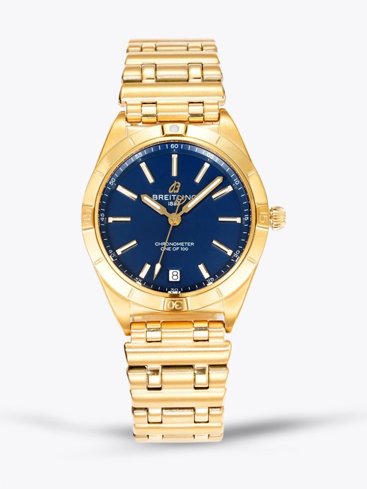 Stick hour markers in gold and corresponding hands rest easily atop the blue face, providing uncluttered readability and urbane sensibility. A low-profile 6 o’clock date window combines style with functionality.