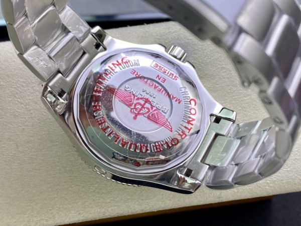 A functional 3 o’clock date window shows the date in plain sight with a white background and black numbers. The correct minute scale on the dial perimeter enhances readability of time. Below the 12 o’clock position, at a safe distance, is the traditional “BREITLING” logo, lending a touch of elegance.
