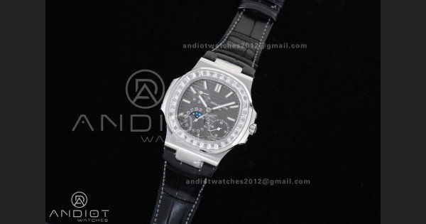 Reviews Over Nautilus 5712 Full Diamonds SS PPF 1:1 Best Edition Gray Dial on Black Leather Strap A240 Super Clone V3