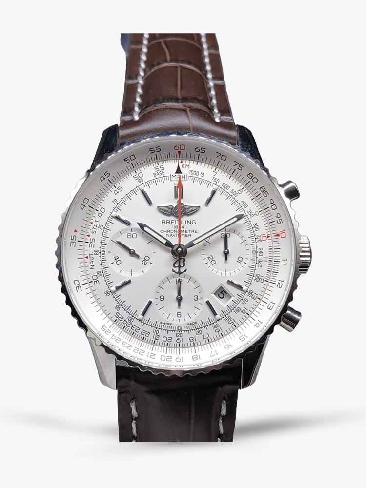 The white face comes with shining stainless steel hands and markers. This makes it highly readable under any light. A red arrow-tipped central seconds hand bearing the Breitling logo adds to its classic sophistication.