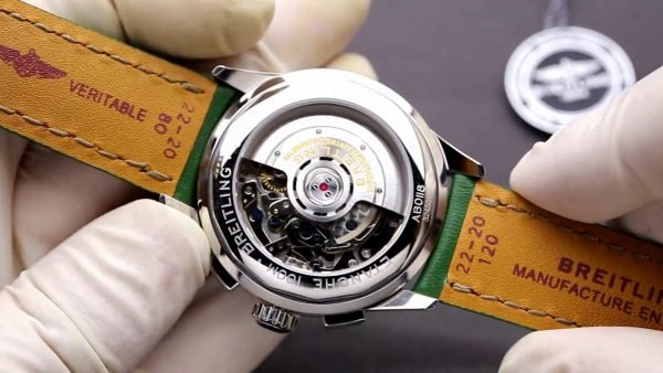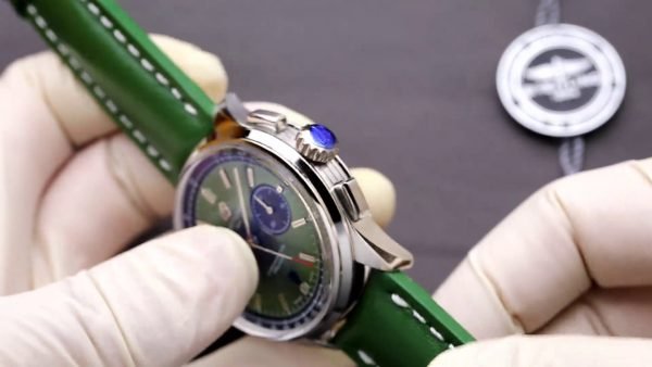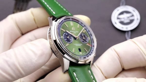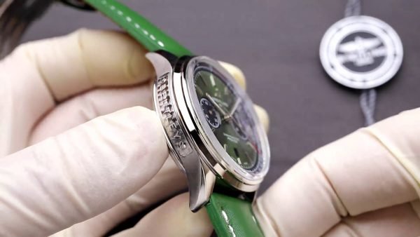 On the wrist, the Breitling Premier AB0118221L1P2 replica features a handsome green sunburst dial. It includes a 42mm stainless steel case and a round stainless steel case. The dual black sub-dials and date window at six o’clock definitely add to usability. Made with a quality Swiss movement, it keeps the time daily. The smooth green leather strap gifts a stylish appearance as well as comfy feel. For enduring beauty, the dial is safeguarded with scratch resistant sapphire crystal.