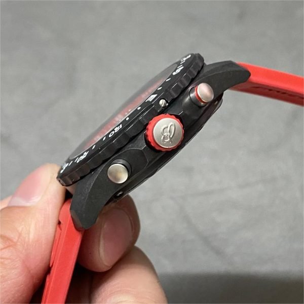Fitted with three subdials and a date display at 4 to 5 o’clock, this chronograph provides the optimum blend of performance and design. With a case of rugged thermoplastic resin that provides light comfort and toughness and a red rubber strap that brings sporty, attention-grabbing style, this watch is ready for anything.